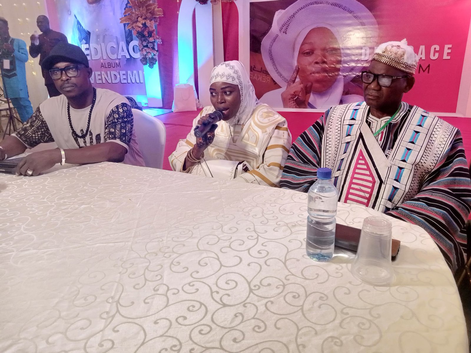 Le présidium, composé de l’artiste, au milieu micro à la main, Madam Zongnaaba, auteur de l’album arangé par Kevinson, Jacky el-feno à sa droite, sagne yiri Naaba Madi à gauche de l’artiste.