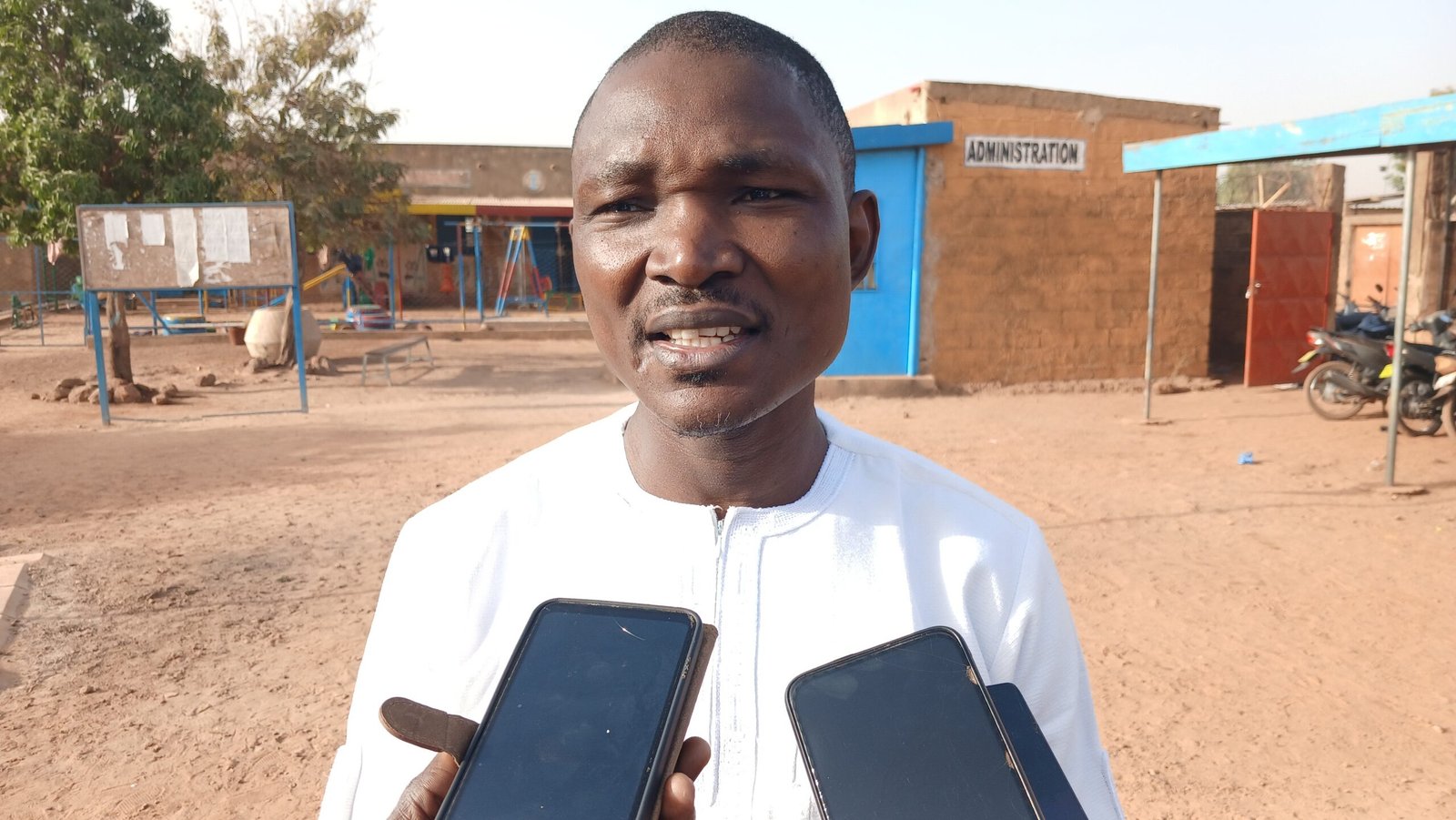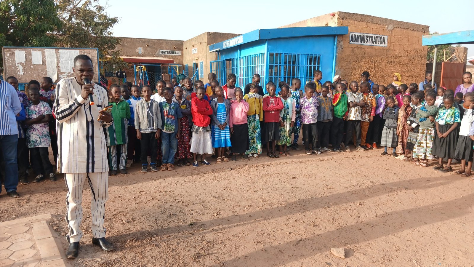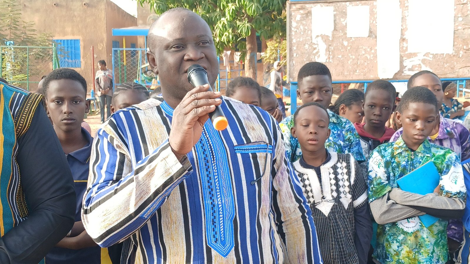 Monsieur Oumar SOULAMA, Chef de la Circonscription d’Éducation de Base de l’arrondissement n°5, lors de la cérémonie de montée des couleurs nationales à l’école Les Petits Futés Sainte Marie Faustine.