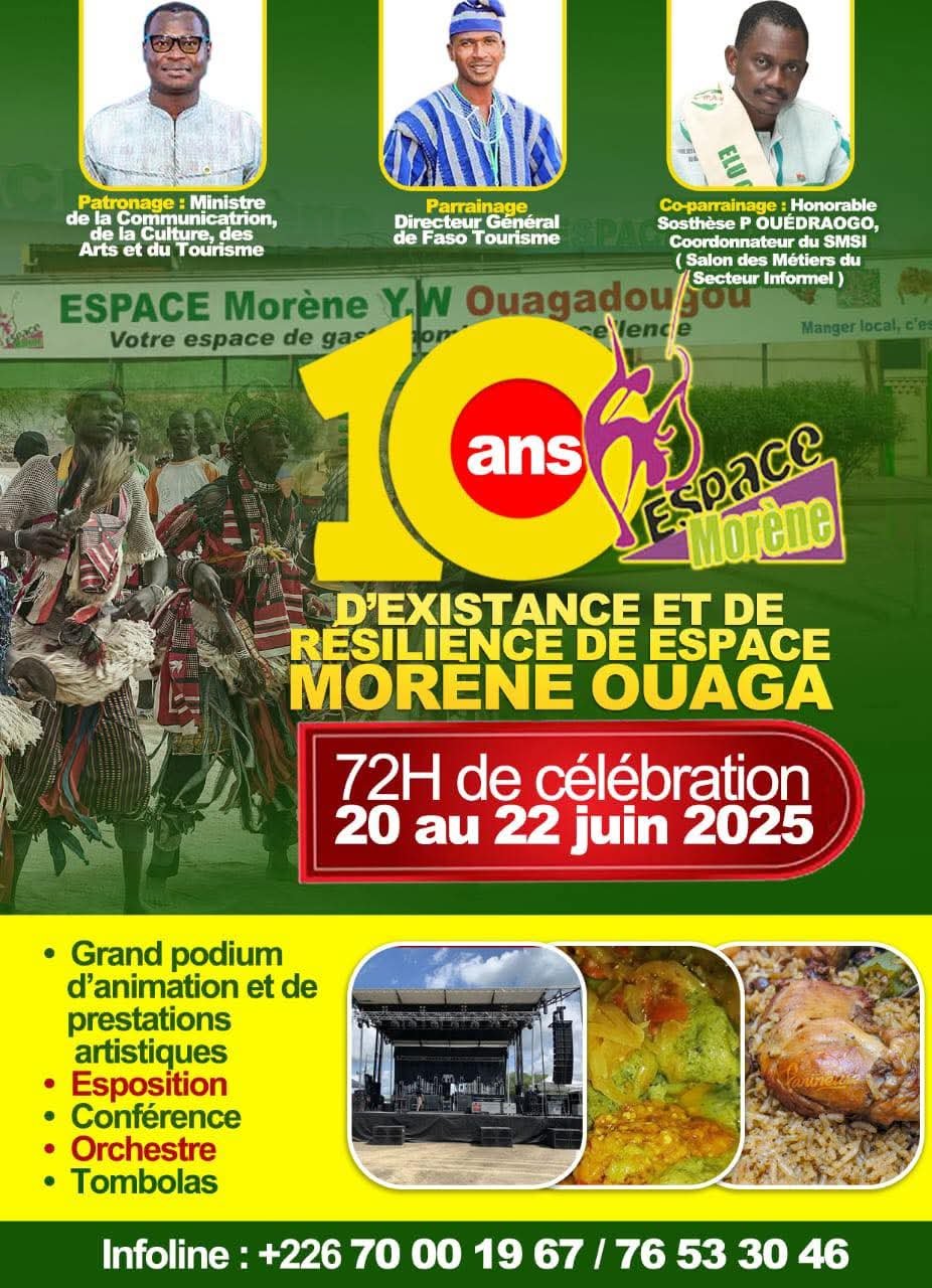 Du 20 au 22 juin 2025, l’Espace Morène Ouaga célèbrera ses dix années d’existence à travers une série d’activités culturelles, gastronomiques, touristiques et sociales. L’annonce a été faite ce mercredi 18 juin lors d’un point de presse tenu à Ouagadougou par les organisateurs.