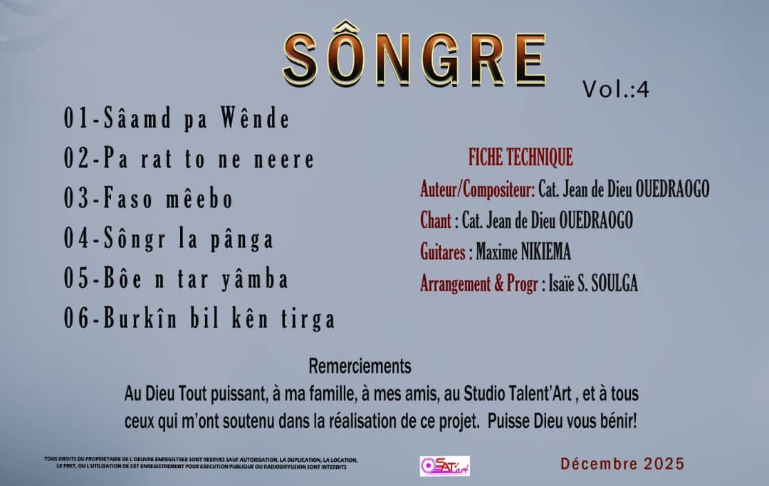 Le quatrième album comprend six titres, entièrement chantés en mooré : “Sâamd Pa Wendé”, “Pa Ral To Ne Neere”, “Faso Mêbo”, “Songr La Pânga”, “Bôe n tar yâmba” et “Burkîn bil kên tirga”. Tous les textes et compositions sont signés par le Catéchiste Jean de Dieu. Le chant est assuré par l’artiste lui-même, les guitares par Maxime NIKIEMA, et l’arrangement et la programmation par Isaïe S. SOULGA.